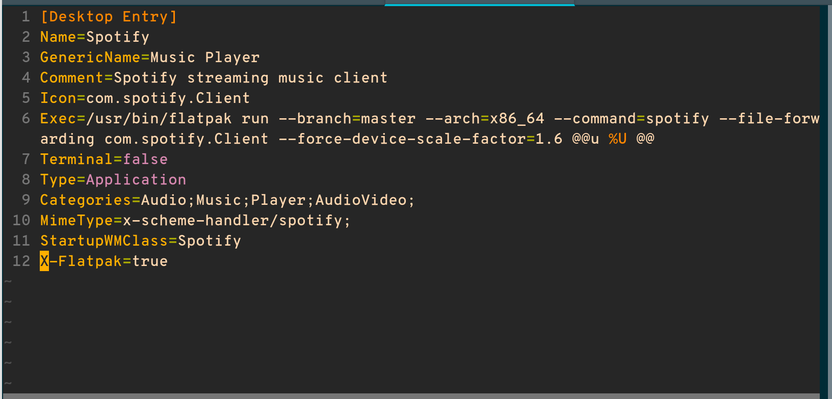 --force-device-scale-factor=Xcommand line option. I findX=1.6works the best for me, but this will change depending on your setup. So, full command to do this in your terminal emulator isflatpak run com.spotify.Client --force-device-scale-factor=1.6. - In order to make this change permanent, you can modify the desktop file to send this command line option whenever Spotify is launched via the icon. cd /var/lib/flatpak/exports/share/applications/ and edit the com.spotify.Client.desktop file as root with your favorite text editor. Change the