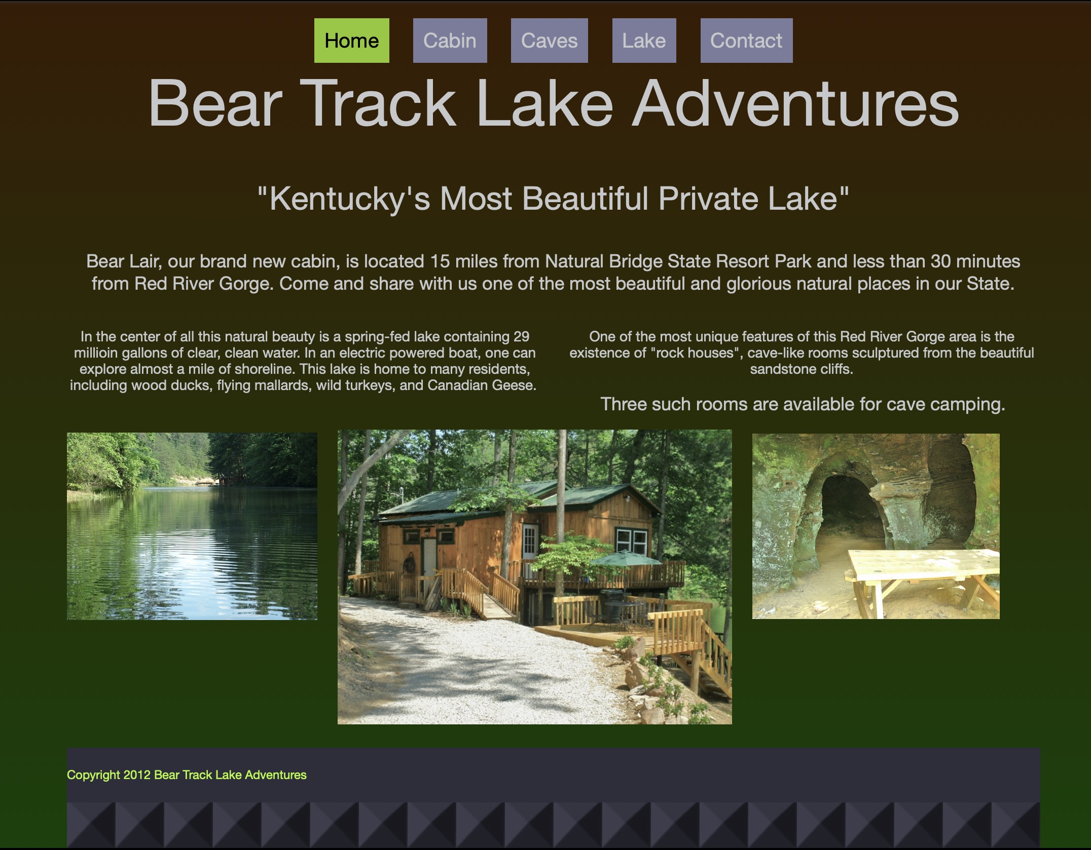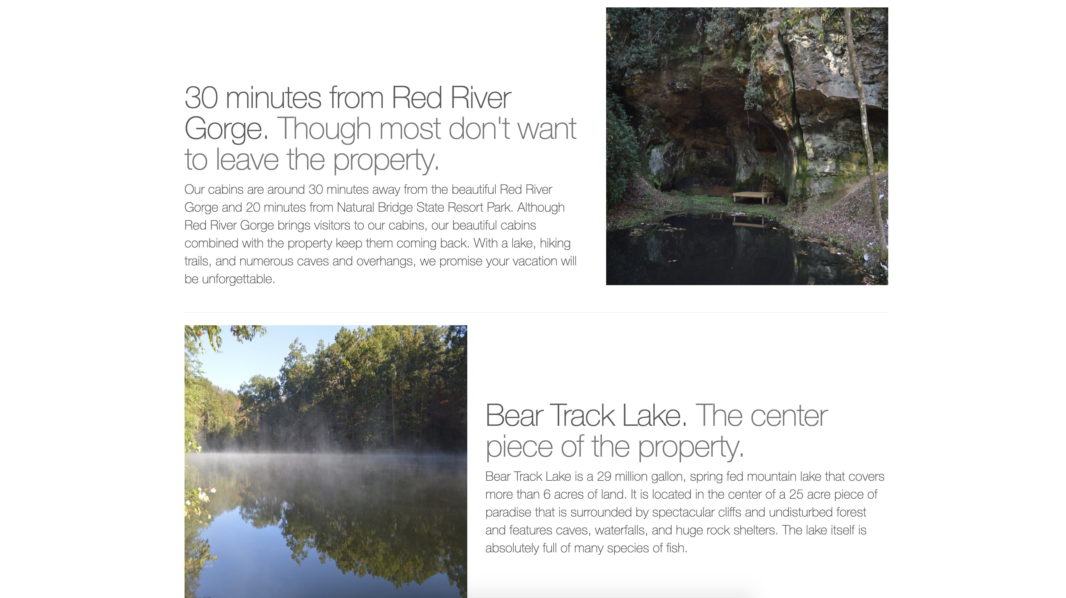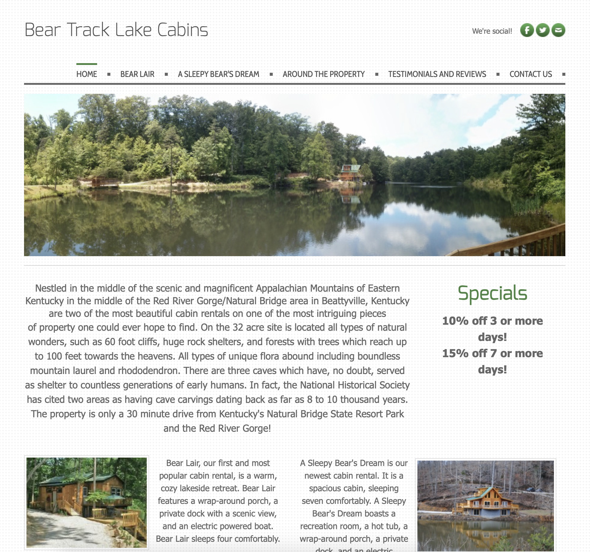 For context, Bear Track Lake Adventures is a cabin rental business in the Red River Gorge area in Kentucky. There are three cabins for rent: Bear Lair, A Sleepy Bear’s Dream, and A Sneaky Bear’s Hideaway. They are all located next to a six-acre lake on a beautiful piece of property that I’m lucky to have grown up on.