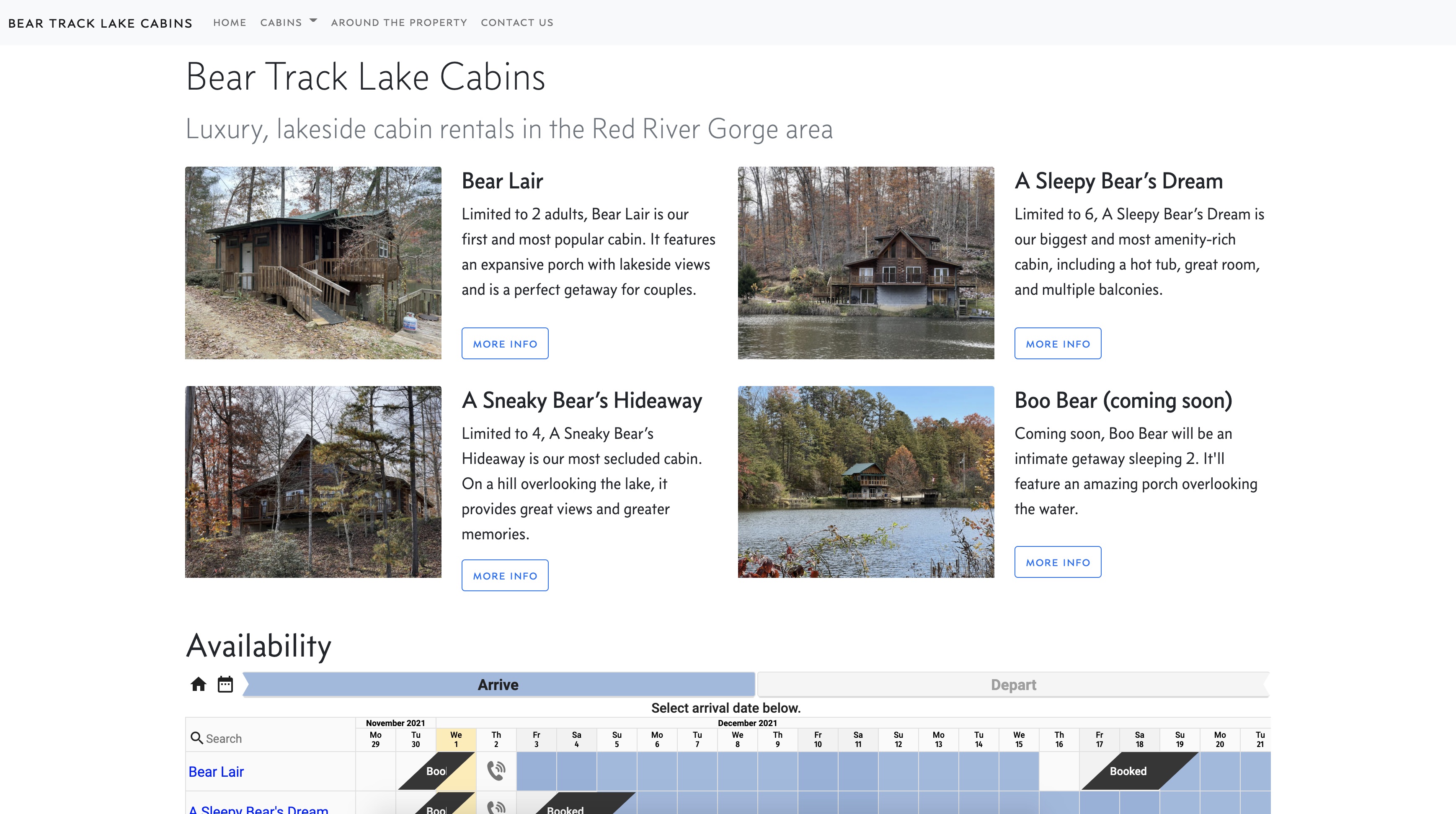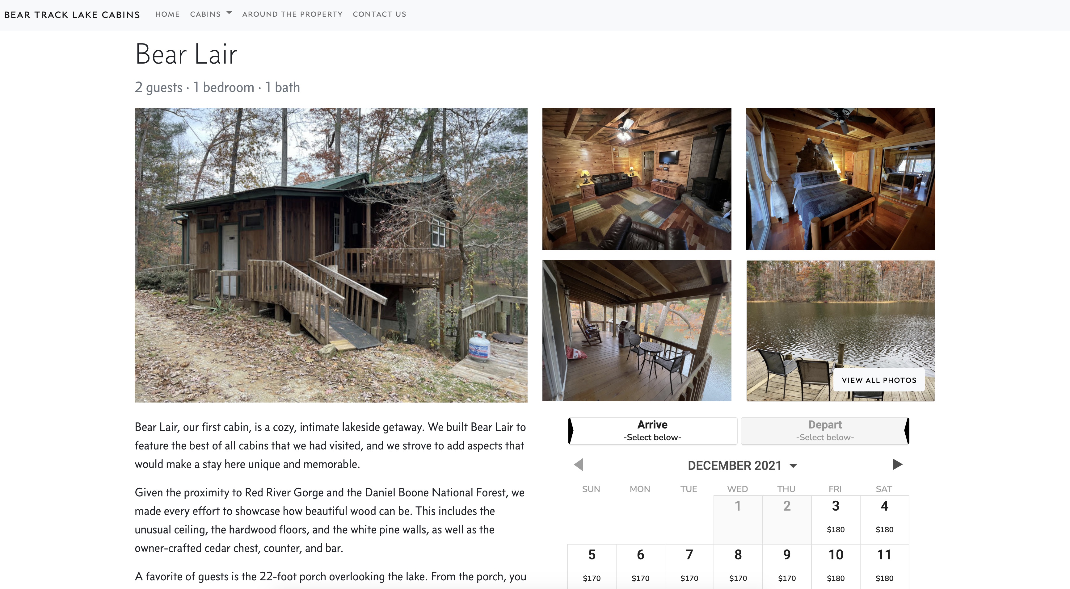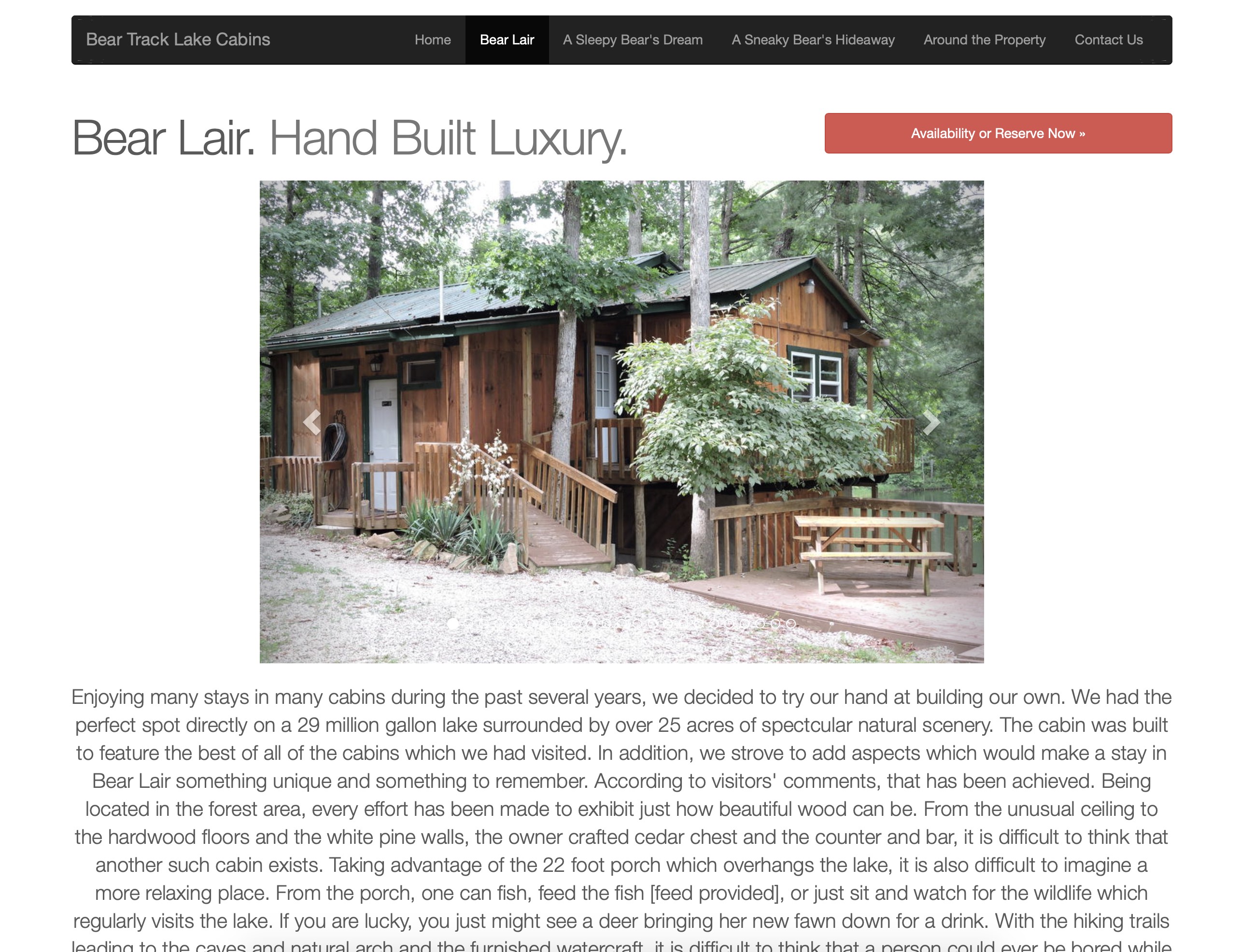 The individual cabin pages kept the same general structure, with a description on top, an image carousel in the middle, and amenities and booking information below.2